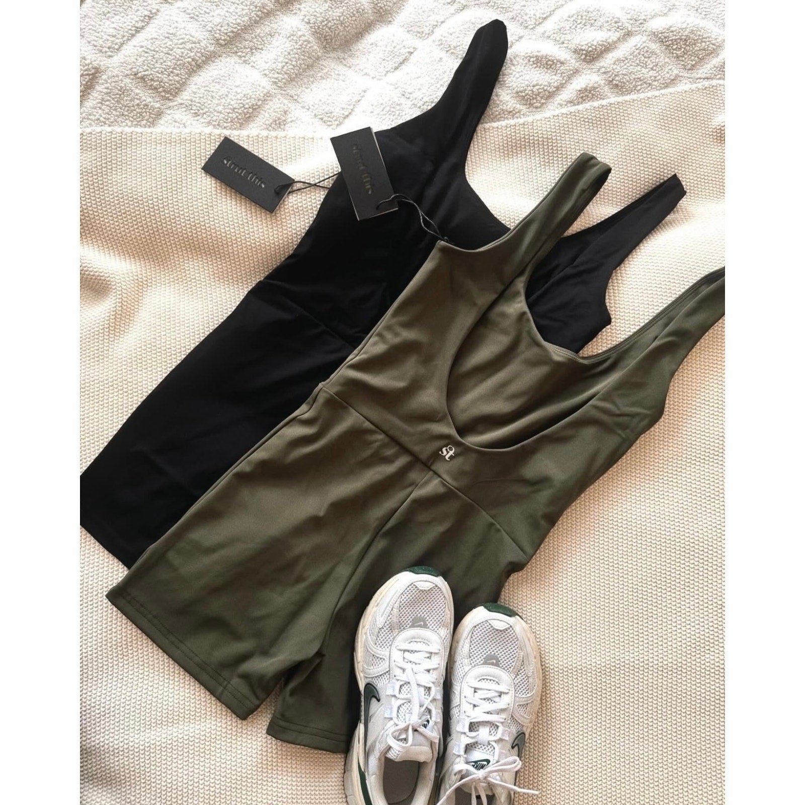 Fitted jumpsuit Thick straps Square neckline Low-dipped back 4" with stretch Inseam Mid-to-High Compression Breathable double-knit 4-way stretch Sweat-wicking Durable, long-lasting. Machine washable, tumble dry low or hang dry Made in Los Angeles, California