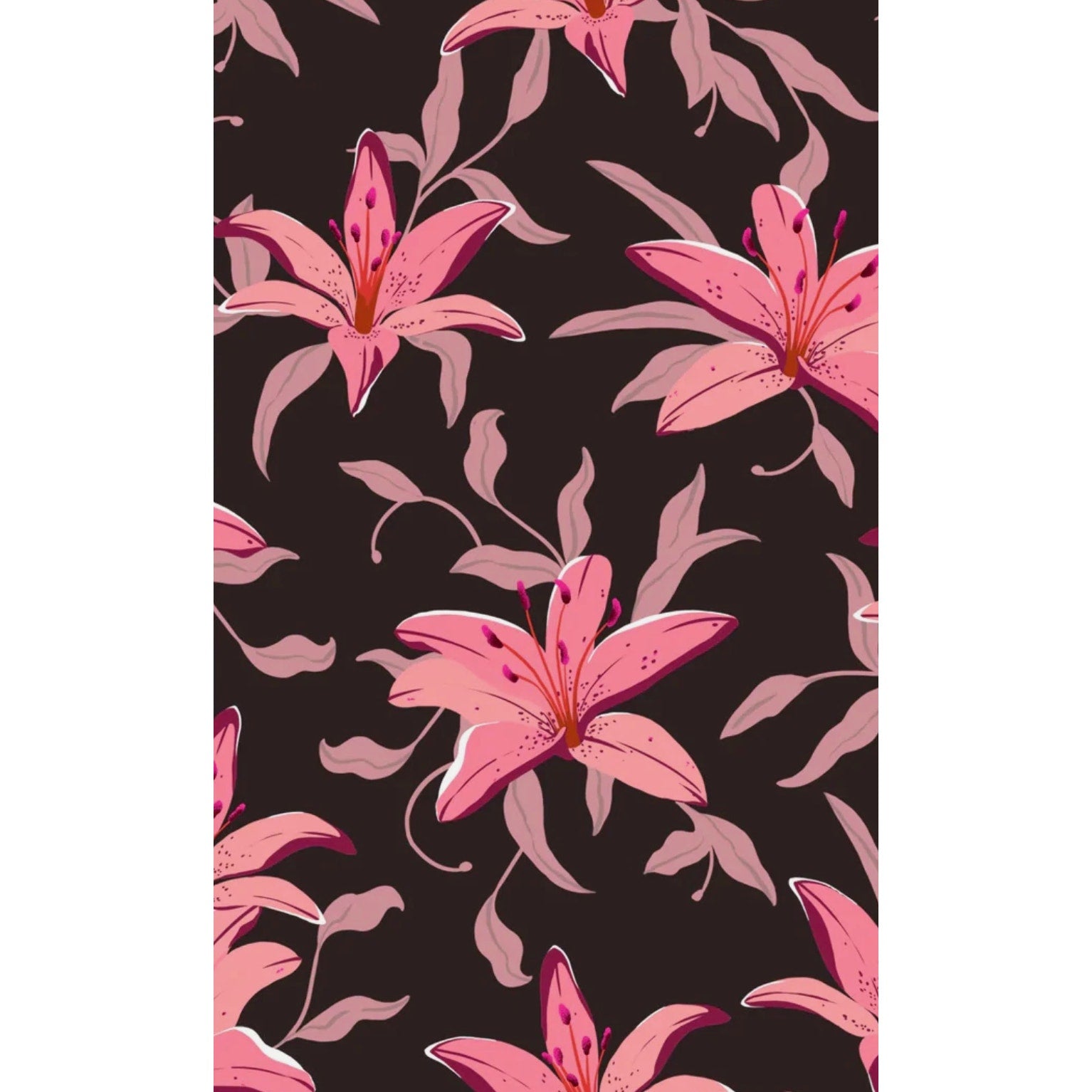 Close-up of Madonna floral print – pink lilies and green foliage on a deep brown background.