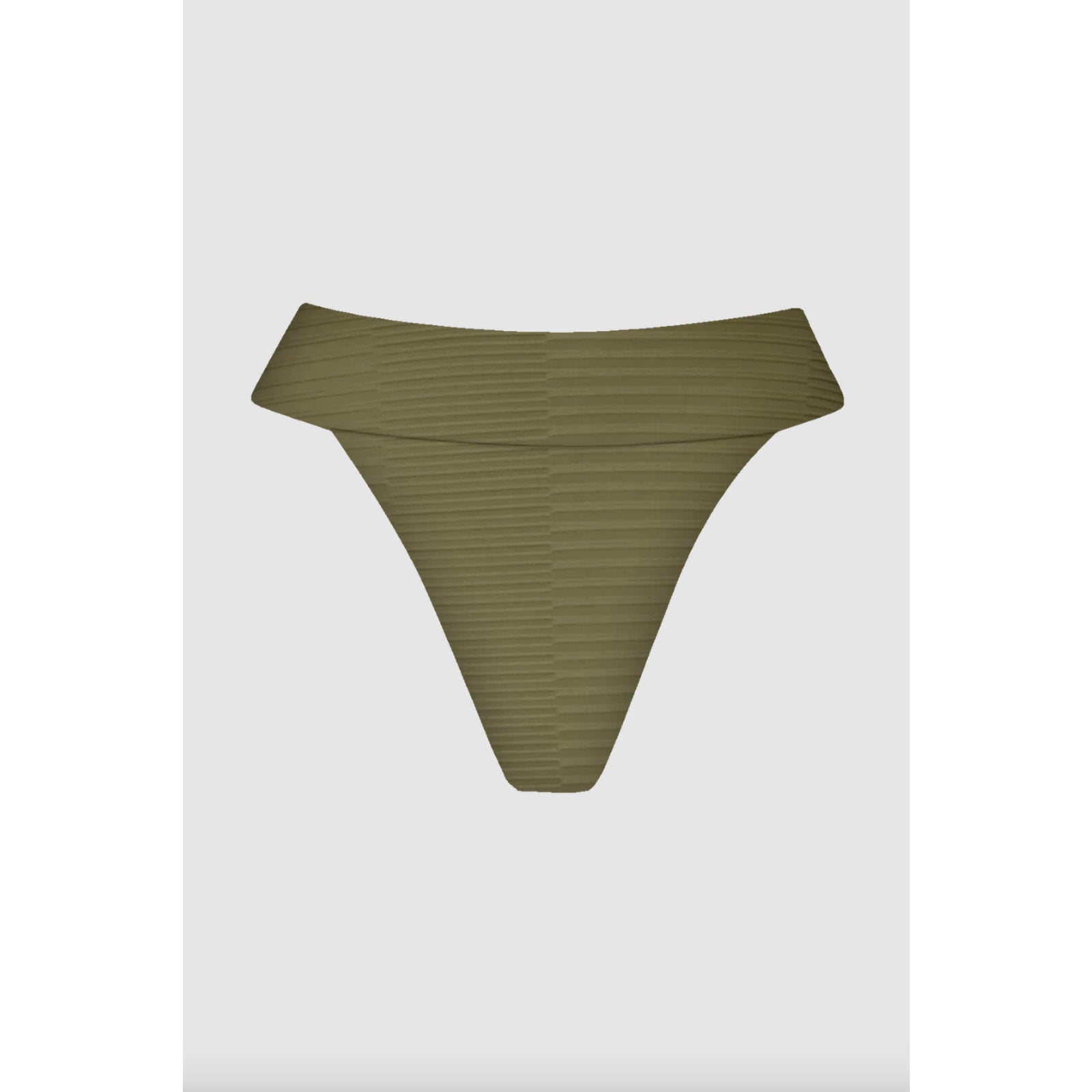 Olive green ribbed Acacia Swimwear Mateo bikini bottom laid flat with dual ribbed fabric texture.