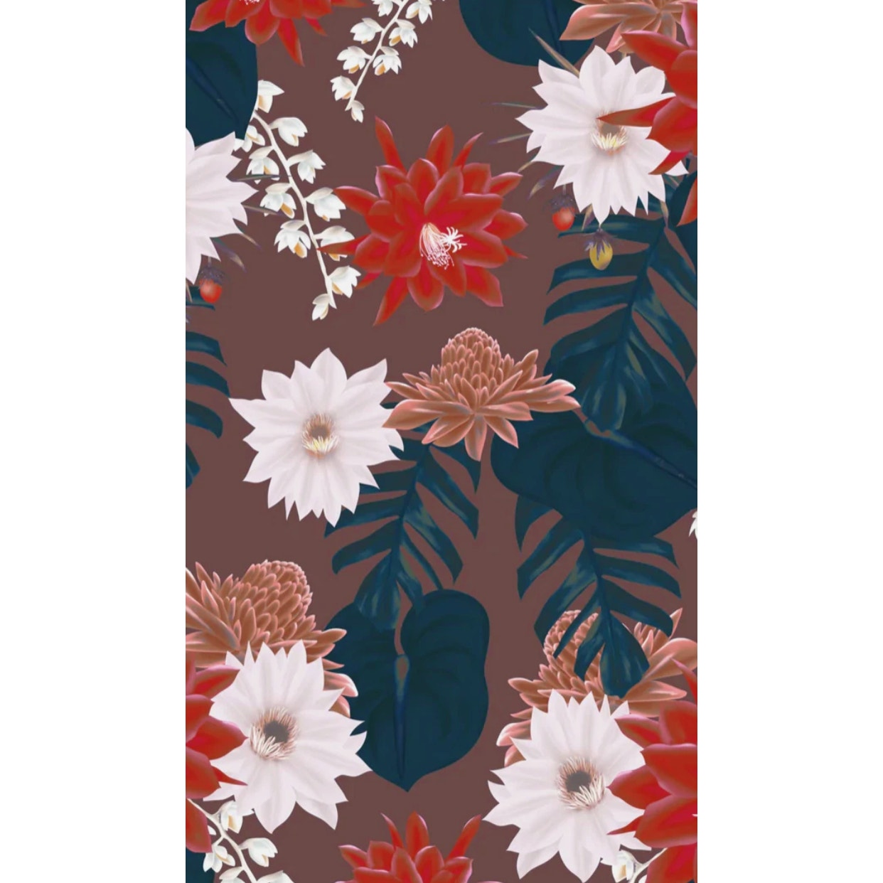 The Buket print showcases a rich chocolate-brown base adorned with vibrant florals in crimson red, deep teal, ivory, and tan—a moody yet romantic color palette inspired by tropical botanicals in bloom. This refined combination of earthy and jewel tones creates a timeless, elevated aesthetic perfect for sun-soaked escapes or sophisticated poolside lounging.