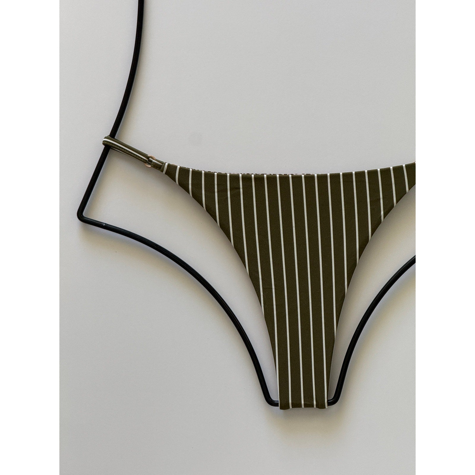 The Acacia Swimwear Ralphy Bikini Bottom in Hinahina is a minimalist yet striking piece featuring a deep olive green base with vertical cream pinstripes. This colorway exudes a clean, elevated aesthetic while maintaining a subtle edge.
