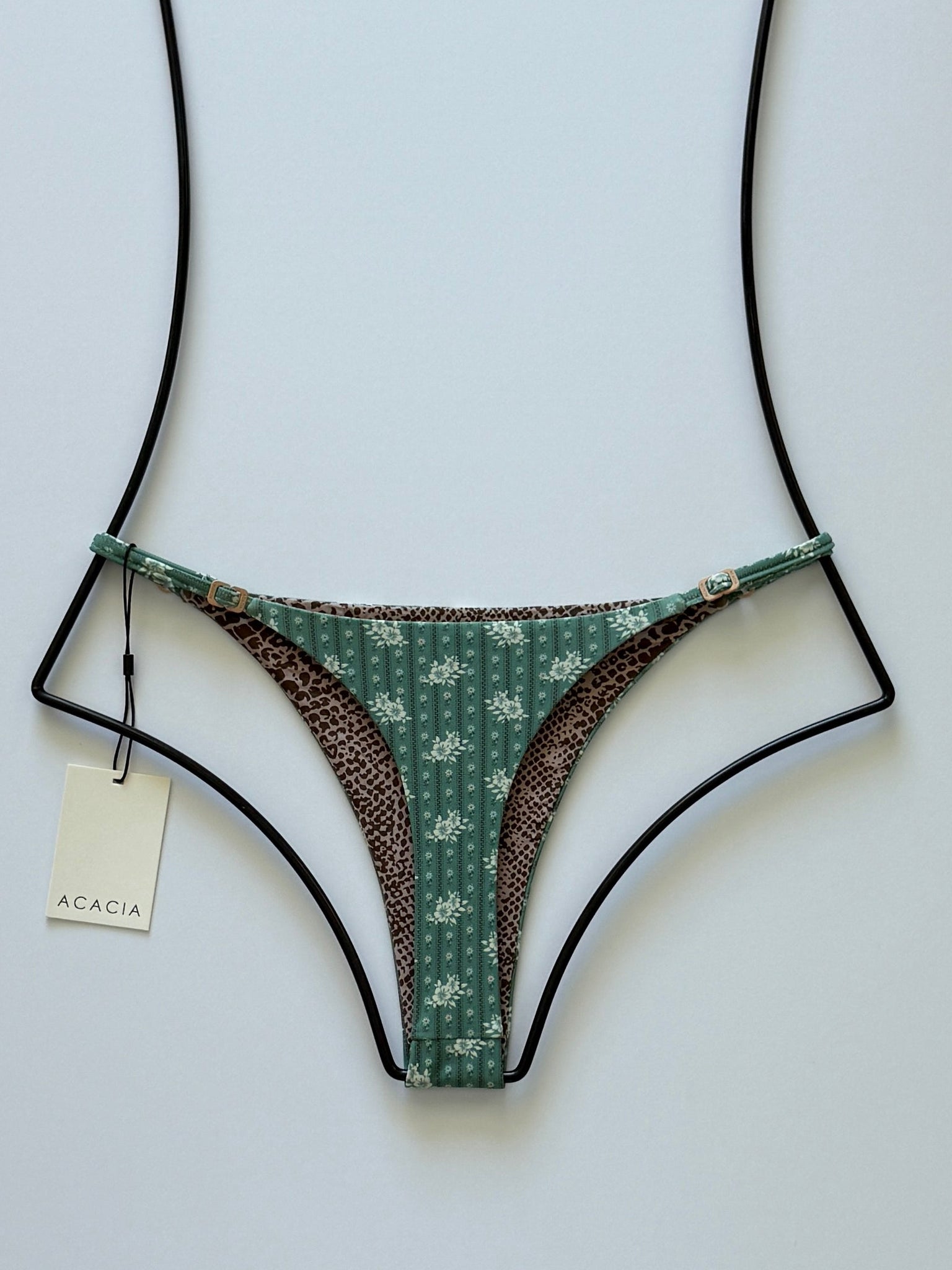 The Acacia Swimwear Ralphy Bikini Bottom in Punahele features Acacia’s signature minimal coverage cut, designed to flatter with a high-cut leg and adjustable side straps. The Punahele print showcases a muted sage green base with delicate ivory floral motifs and subtle vertical striping for a soft, romantic finish.