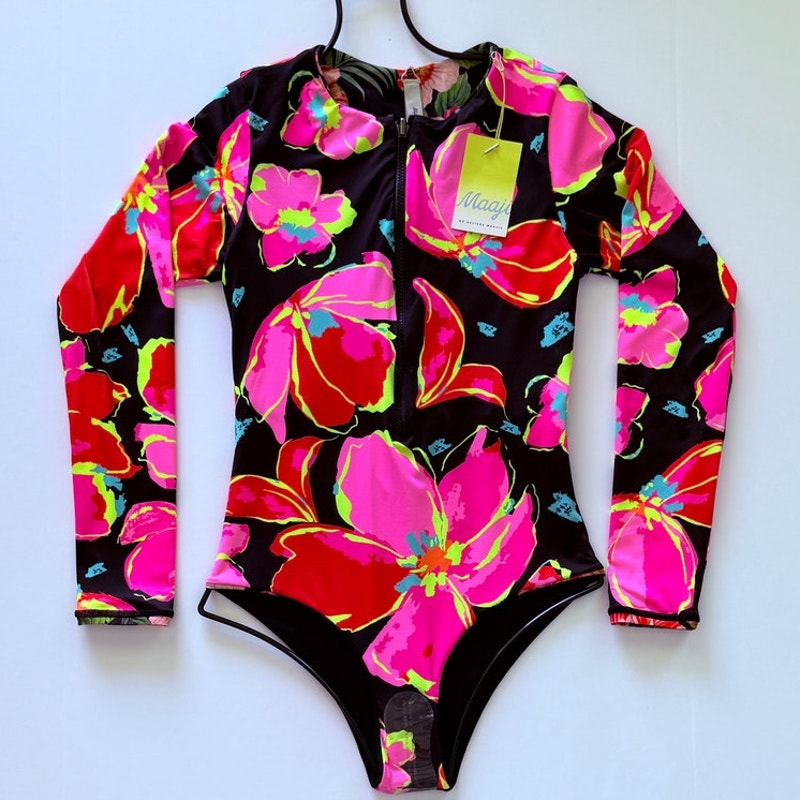 Garment Features: Reversible Full coverage Long sleeves Zipper Stylizing cuts Reversible to Maajico surprise print No soft cups Medium coverage Recycled fiber Made in Colombia 72% Recycled Polyamide, 15% Polyamide, 13% Spandex Knit