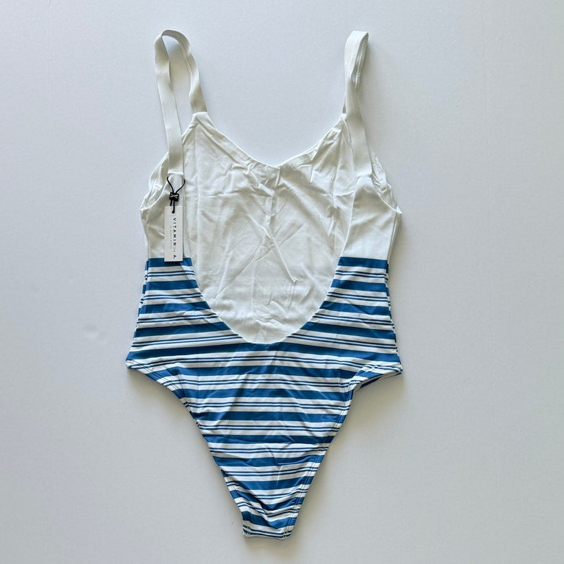 A timeless nautical classic with a modern supermodel silhouette, the Vitamin A Leah One Piece in Regatta Stripe delivers effortless coastal style and a sculpting, flattering fit. The fully open back, high-cut thigh, and cheeky coverage create an elongated, confident look perfect for both beach days and styling as a bodysuit.