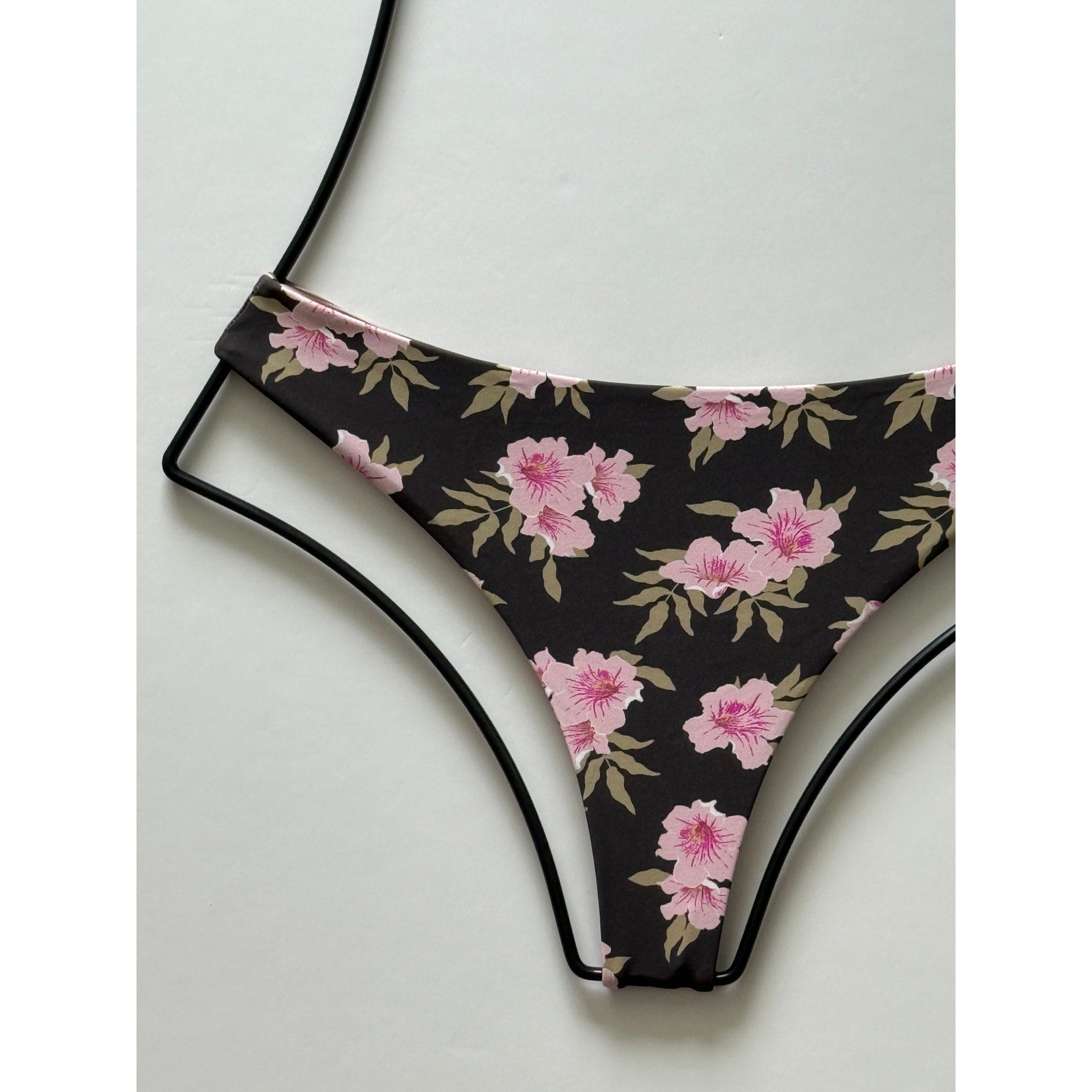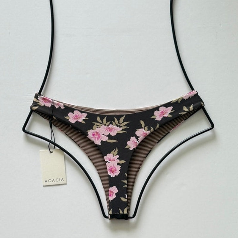 Elevate your swimwear collection with the Acacia Swimwear Brazil Bikini Bottom in Floret. This piece features a deep chocolate brown base adorned with delicate pink floral blooms and soft green leaves, creating a feminine and romantic look. The signature Acacia Brazil cut offers a flattering, cheeky fit with a seamless finish, perfect for tanning, swimming, or styling under breezy resortwear. A timeless floral print meets modern minimal design—ideal for both beach days and vacations.